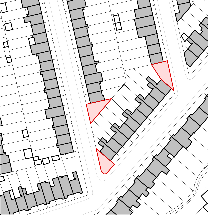Sometimes a piece of land can be found at the rear of an urban block, as shown on the map on the left.