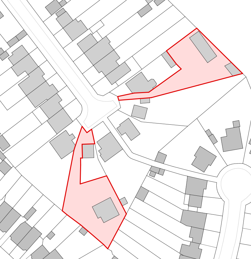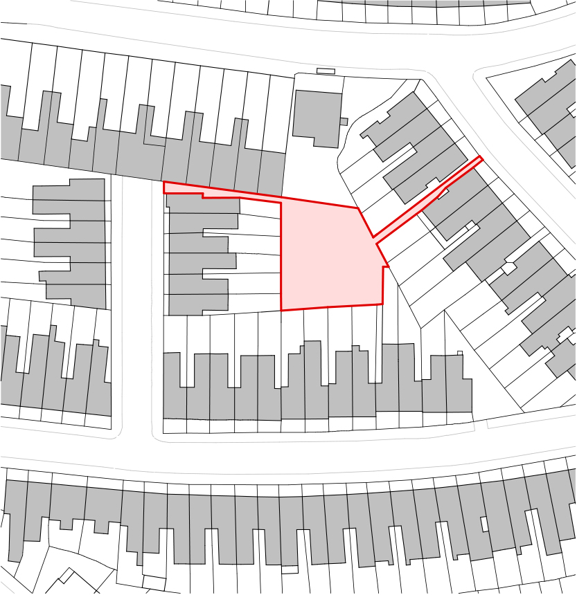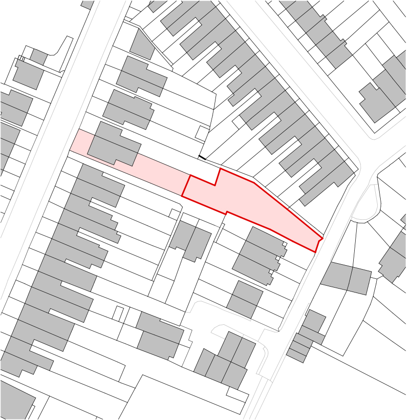 Properties with large gardens can sometimes accommodate a new garden plot development by partitioning off part of the land. The map here shows a garden plot with a separate access road running along the rear. For end-of-terrace houses with large gardens, access may be possible via a side road instead.